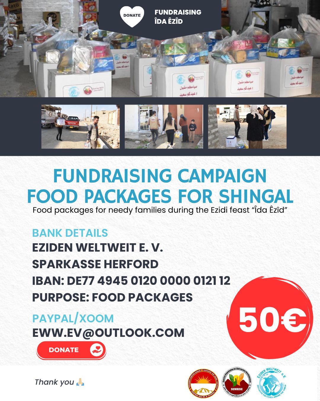 Liebe Freundinnen und Freunde, auch in diesem Jahr möchten wir – in Zusammenarbeit mit dem „Kongress der Eziden“ und unserem langjährigen Partner „Sunrise“ – Familien zum Îda Ezî helfen, ein schönes Fest zu feiern. Dafür brauchen wir Eure Hilfe☀️Îda Êzî ist ein sehr wichtiges, heiliges Fest der Eziden zu Ehren